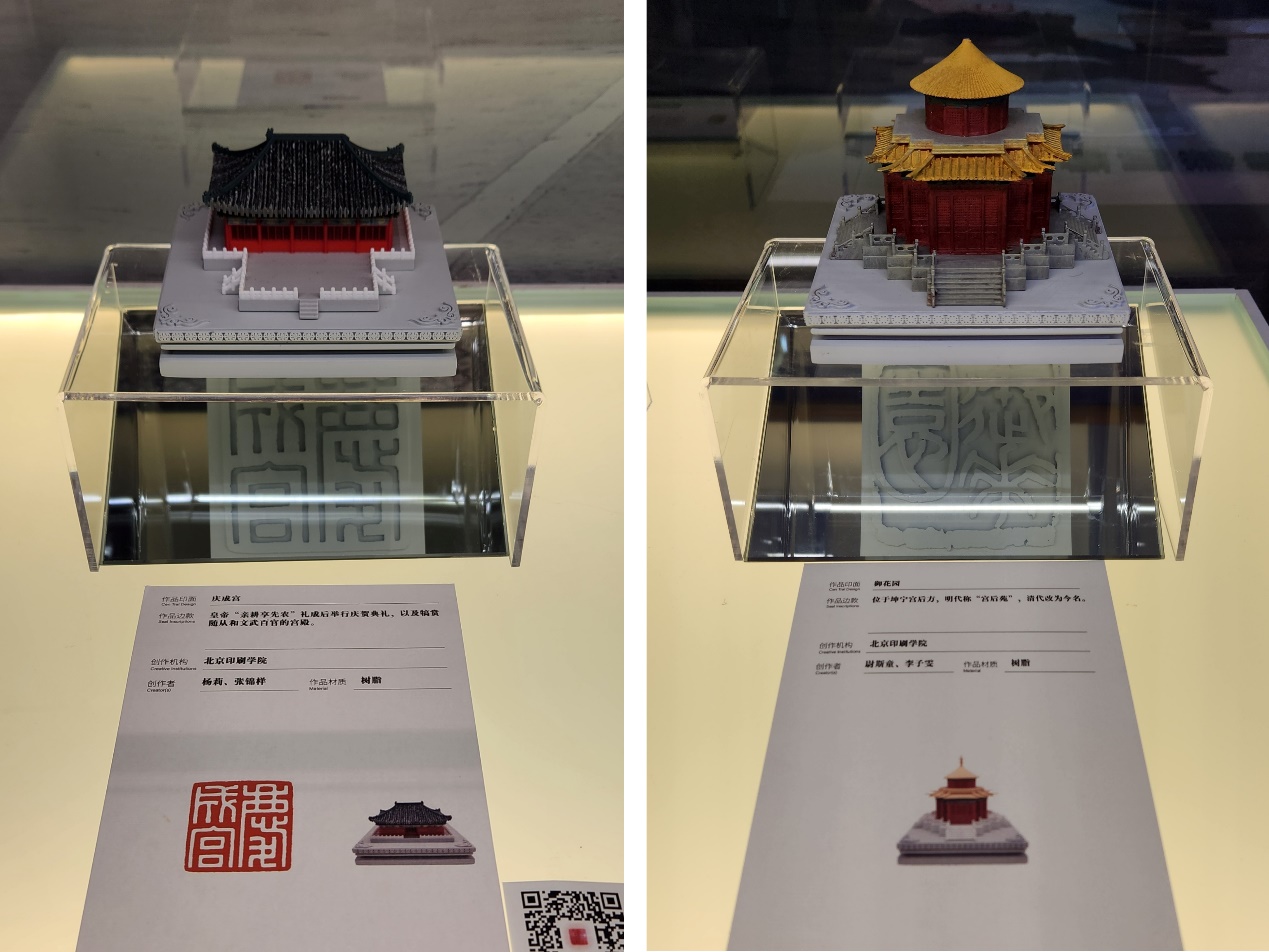 本次参展作品分为印面篆刻创作和印纽及印身设计制作两个部分,印纽及印身设计制作由杨莉、胡明辉、赵颖、杨默涵、牛明明、巫建等教师团队对中轴线上的代表性建筑进行高精度三维建模设计并完成3D打印制作,同时也为本次展览的虚拟展示部分搭建了建筑模型素材,印面篆刻创作由窦向亲、龙友、崔迎春、黄勤、孙浩等教师团队完成。