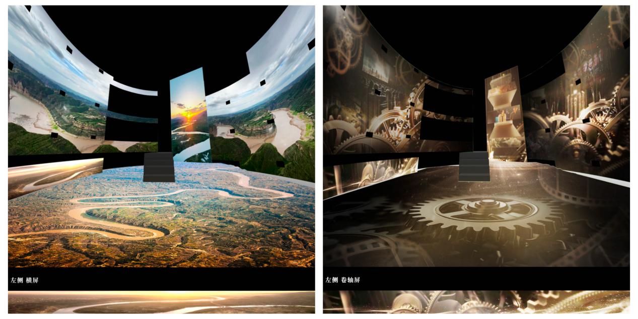 在创意的前期阶段,团队运用三维技术对中国电影博物馆中央圆厅的屏幕空间进行了精准还原,旨在提供最佳视角,以便全面呈现整体影片的氛围感。同时该技术有效展示了四屏联动的优势及其整体性,增强了观众的沉浸体验。此外,设计团队还将前期制作的分镜图置入三维软件的屏幕中,通过渲染生成高质量图像,以达到展示效果和辅助决策的作用。