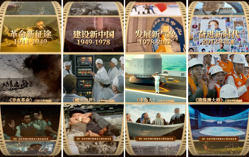 本次展览旨在以电影为视角回顾新中国的建设发展历程,系统呈现党的十八大以来中国电影取得的成就,凝聚人民群众的爱党爱国情感和奋进力量。展览内容共分为两部分。第一部分是“光影铭记历史”,通过《开国大典》《我和我的祖国》等多部优秀国产影片串联起新中国成长发展的历史,以“革命新征途”“建设新中国”“发展新气象”“奋进新时代”为时间线索,展现中国共产党团结带领全国各族人民从站起来、富起来到强起来的伟大飞跃。第二部分是“银幕绘就华章”,从创作生产、科技发展、交流合作的角度,展现中国电影进入新时代以来在电影创作、电影票房、银幕数量、技术创新、中国制造、拓展发行网络、丰富合作形态等各方面取得的显著成就。