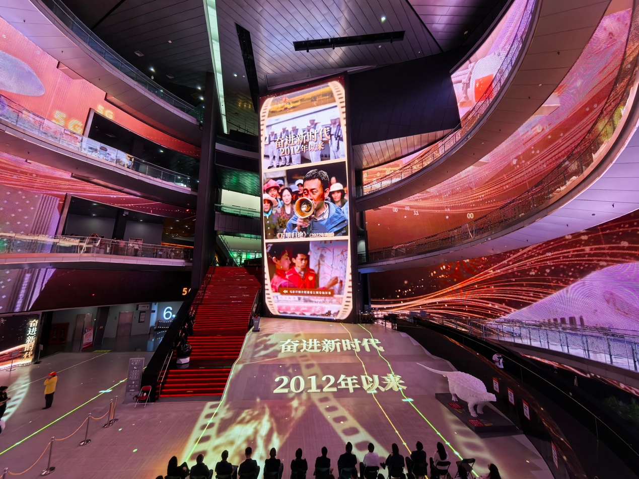 展览第一部分以抽象的放映机作为核心串联元素,通过其放映内容紧密联系四个重要主题:革命新征途、建设新中国、发展新气象和奋进新时代。这一设计不仅梳理了“光影铭刻历史”的四个时间节点,更深刻表达了这些历史瞬间对中国发展进程的影响。通过层次分明的视觉呈现,力求在观众心中留下深刻的印象,使其感受到光影交错中所蕴含的历史厚度与时代变迁。