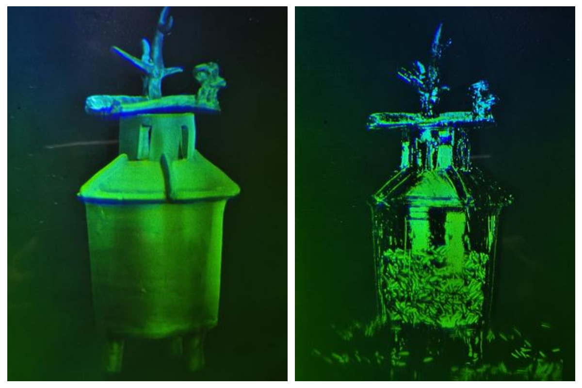 为了确保全息影像作品能够精准传达文物的历史价值和文化内涵,2024年5月至10月,全息艺术实验室成员朱植林、马小爽、李家辉等与中国农业博物馆的专家进行了多次深入的交流与对接,力求最准确地理解和再现文物背后的故事。在此基础上,团队进行了30余次的设计绘制,每一次都力求更贴近文物的真实面貌及其所承载的历史信息。经过多次技术测试,通过多角度的精密合成,不仅精确复现了文物的外观,还生动还原了其内部储存粮食的场景,为观众提供了沉浸式的体验。
