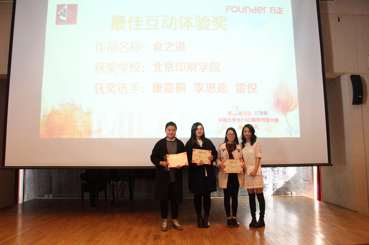 3月20日下午,由北京北大方正电子有限公司主办,时尚集团、意大利驻华使馆协办的第二届中国大学生“方正·飞翔奖”PAD版面创意大赛在意大利驻华使馆文化处剧场举行颁奖典礼。北京印刷学院设计艺术学院副教授隋涌带领学生团队康嘉桐、李思愿、雷悦创作的作品《食之道》获得最佳互动体验奖;隋涌荣获优秀指导教师奖;北京印刷学院设计艺术学院荣获特别组织贡献奖。