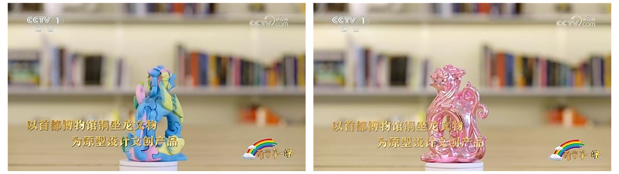 2024年《开学第一课》以“可爱的中国”为主题,全景式呈现中国式现代化的美好图景和多元魅力。在“文明中国”板块,北京印刷学院设计艺术学院与首都博物馆合作开展的“‘京’彩文化 青春绽放”行动计划“古都行”项目成果文创IP铜坐龙,与“蛟龙号”“雪龙2号”“华龙一号”“威龙”等大国重器,从历史、现实、未来贯通的时空维度,体现了中国传统龙文化在当代持续释放强大的精神力量,成为今天我们建设中华现代文明、激发创新活力的文化基因。