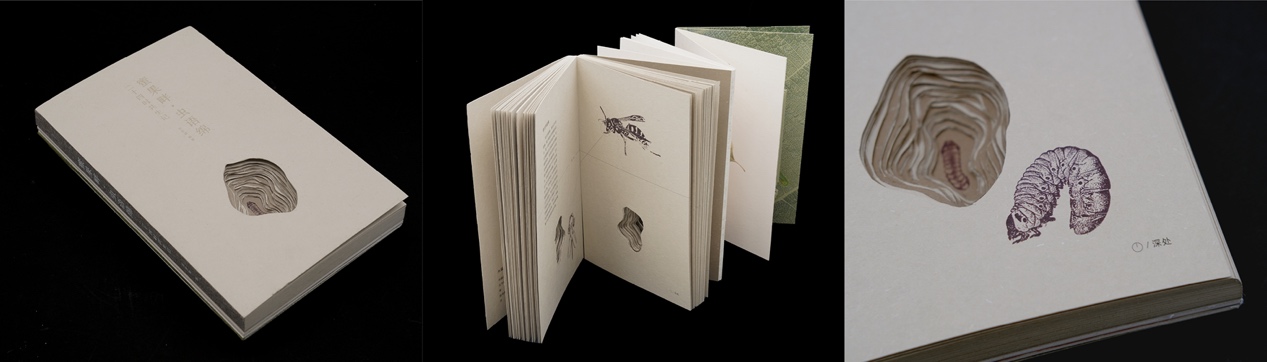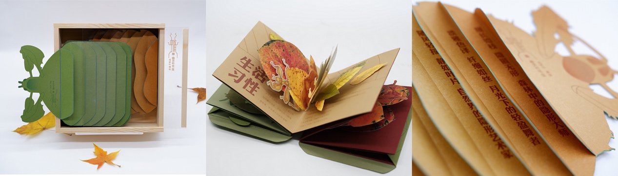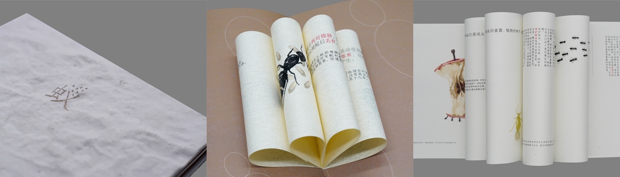 高扬设计的《虫·珀》与研究生戎妍中设计的《䗛·竹节虫》、袁雪瑶的《昆虫弹跳力》、刘世婧的《蜜果畔·虫语绵》、刘洋的《蚁》在“昆虫之书”专题研究展单元展出。作品通过书籍设计的艺术语言展示了设计者对昆虫世界的独特视角和深刻洞察,兼具艺术、科普和美育价值。