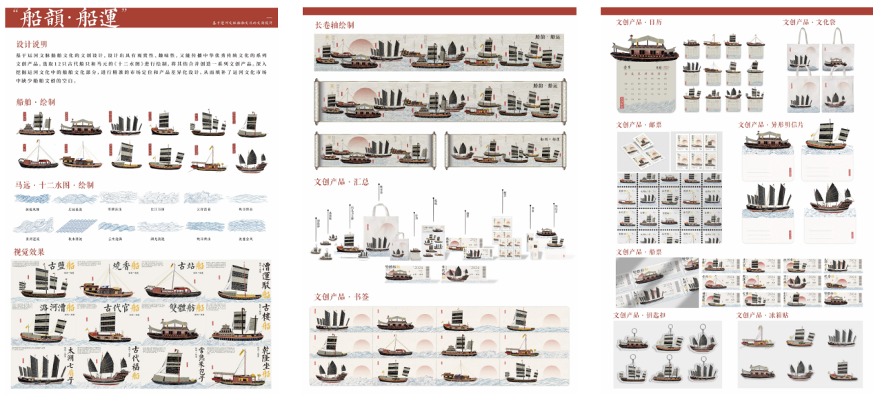 该作品以“大运河因运而生,因船而兴”为核心理念,基于运河文脉的船舶文化设计出既具有观赏性、趣味性,又能传播中华优秀传统文化的系列文创产品。团队经过大量文献调研,将主题锁定为船舶。船舶作为传播南北文化交流的重要物质载体,其影响意义深远。团队选取古代12个不同功能的船舶和马远《十二水图》的12个水形象符号语言进行文创设计创作,旨在结合船舶文化和水文化所形成的漕运文化,深入挖掘运河文化中的船舶文化部分,填补了运河文化市场中缺少船舶文创的空白,为传播运河文化、弘扬中华优秀传统文化作出贡献。