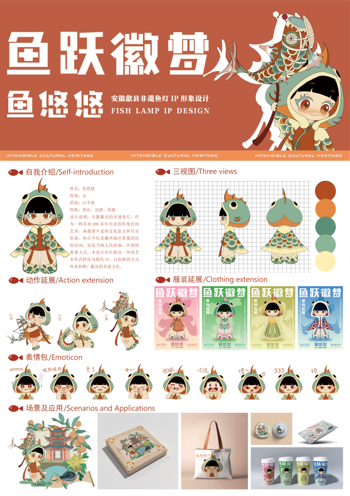 作为一种具有600多年历史的传统民间艺术,安徽歙县的非遗鱼灯承载着丰富的文化意义和历史价值。本设计旨在将这一传统艺术形式转化为现代IP,以创新的方式传承和推广歙县的非遗文化。作品在“鱼悠悠”的形象设计上融合了古代斗篷和旗袍的元素,强调了鱼鳍的流畅线条、鱼头的圆润饱满以及彩绘鱼鳞的精致细腻。在色彩的选择上采用了传统鱼灯中常见的象征着喜庆和祥和的红色、绿色进行搭配。这些形象特征不仅体现了鱼灯的传统美学,也赋予了“鱼悠悠”一种生动活泼的生命力。