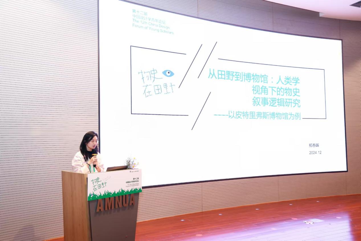 设计艺术学院教师,北京大学访问学者郑春晖投稿参加了本次论坛,并以“从田野到博物馆:物史叙事逻辑的研究——以皮特里弗斯博物馆为例”为题进行汇报。报告从物质文化研究的角度出发,提出“从田野到博物馆”的物史叙事框架,从多角度解析了物品在跨文化语境中的叙事演变,并展示了田野研究如何为博物馆展陈设计提供新思路。