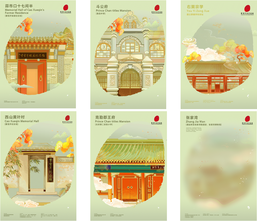 为了实现对北京城市里散点式分布的遗址遗迹进行考证并赋予统一的视觉识别、挂牌管理,进而完善北京博物馆之城建设、深化北京城市内蕴挖掘、打造中国文豪品牌的目标,北京市文物局委托北京设计学会与北京印刷学院设计艺术学院共同承担了“曹雪芹在京遗迹标识工程的研究与设计”课题。在中国红楼梦学会、北京曹雪芹学会、北京市文物保护协会的支持、指导下,在民盟北京市委历史文化委员会的积极参与下,课题组经过近3年的走访调研,基本确认了有历史记载和有据可查的曹雪芹在京生活遗迹七处,包括崇文门外蒜市口地方房十七间半(曹雪芹故居纪念馆)、石驸马大街克勤郡王府(北京实验二小)和辅国公府(鲁迅中学,原北京女子高等师范学校)、西单牌坊北右翼宗学(蒙藏学校)、朝阳半壁店村水南庄、通州张家湾古镇、西山正白旗(曹雪芹纪念馆)。这七处遗迹既有曹雪芹曾居住过的地方,如蒜市口十七间半、西山正白旗,又有曾在《红楼梦》中出现过的地方,如张家湾古镇花枝巷,还有曹雪芹结识好友、留下诗作的地方,如西单牌坊北右翼宗学。
