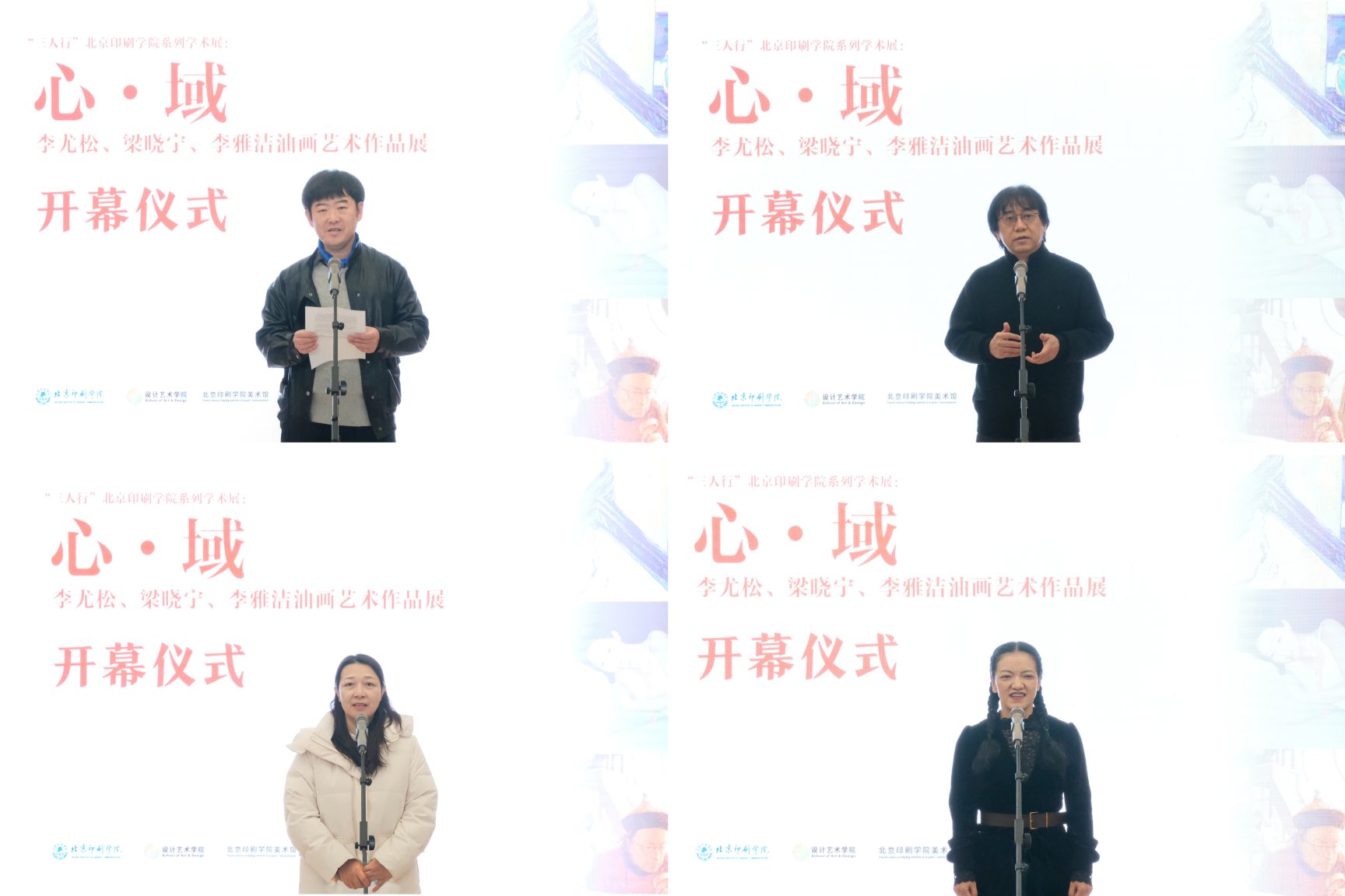 12月11日“三人行”北京印刷学院系列学术展:心·域—李尤松、梁晓宁、李雅洁油画艺术作品展在北京印刷学院美术馆开幕。中国美术家协会插图装帧艺委会主任、北京美术家协会副主席、北京对外友协副会长、北京印刷学院党委副书记、院长田忠利,国家民族画院院长、中国油画学会理事、北京美术家协会理事、中央民族大学美术学院副院长李贵男,中国舞台美术学会副会长、中国动画学会理事、中国戏曲学院新媒体艺术系原主任于少非,黑龙江奥云投资有限责任公司总经理尹鹏飞,绘本画家、田宇绘本工作室创始人田宇,《青年视觉vision》杂志视觉实验室栏目艺术编辑马宁,学校外事处、教务处负责人,设计艺术学院、新媒体学院众多师生参加了开幕式。开幕式由学校美术馆馆长、美术与书法学科负责人、设计艺术学院党委书记史民峰主持。