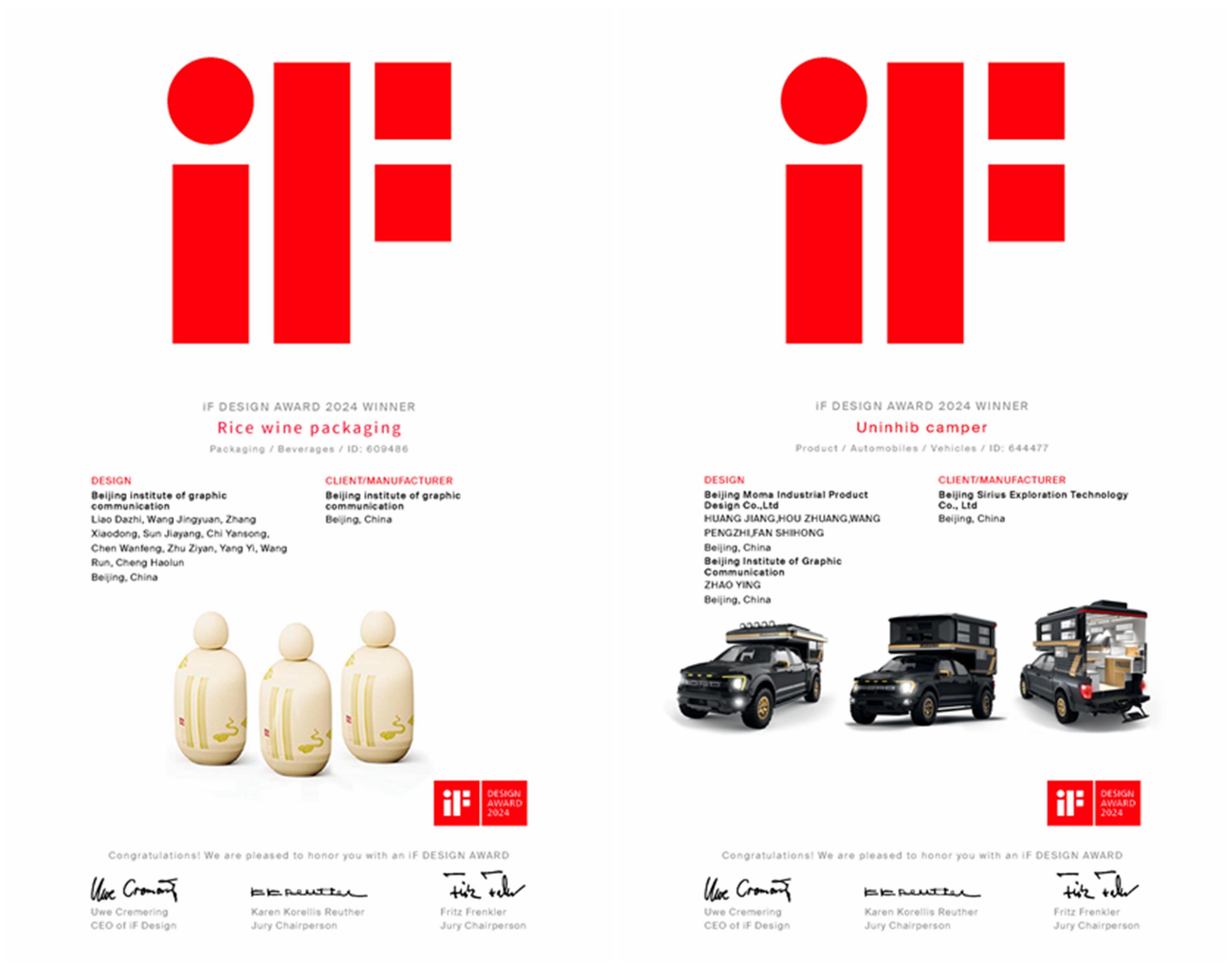 近日,2024德国iF设计奖(iF DESIGN AWARD)公布了最终获奖名单,设计艺术学院教师廖大智、张晓东带领学生团队创作的包装设计类别作品——米酒包装(Rice wine packaging),以及由教师赵颖与国内知名设计公司“木马设计”合作完成的汽车设计类别作品——露营车(Uninhib camper)获两项设计奖。